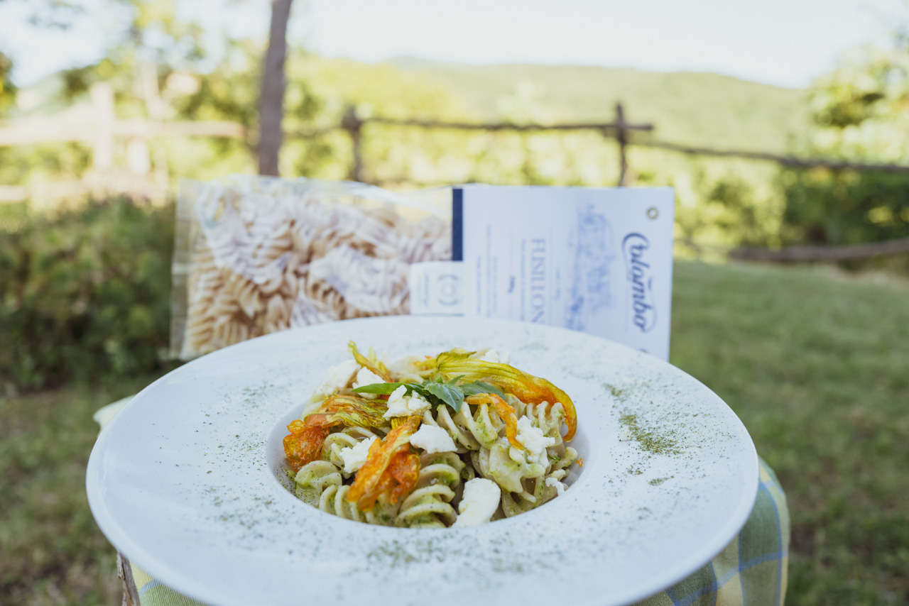 Fusilloni di Senatore Cappelli con crema di zucchine, fiori di zucca croccanti e ricotta salata.