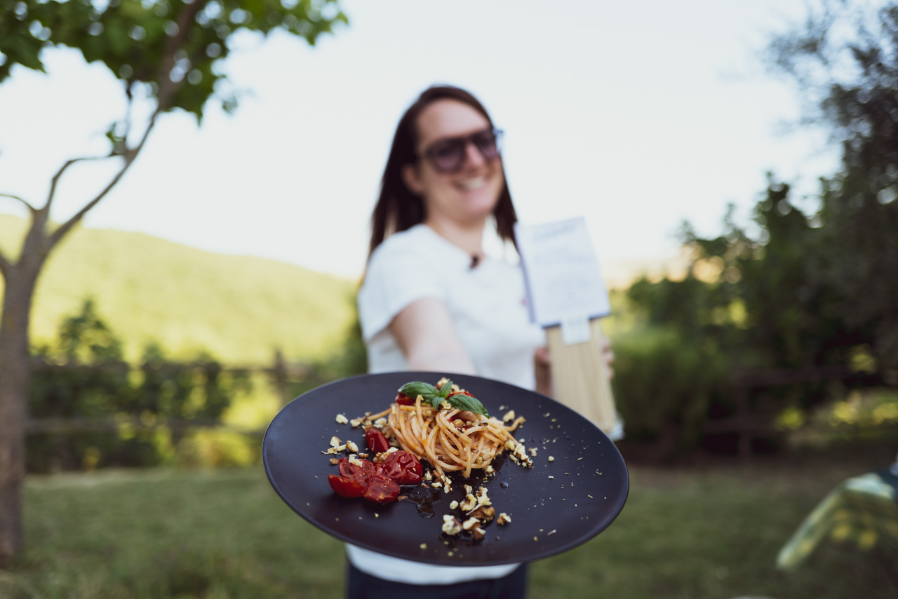 Spaghetti alla chitarra Senatore Cappelli con pomodorini freschi, noci, spolverata di limone e basilico.